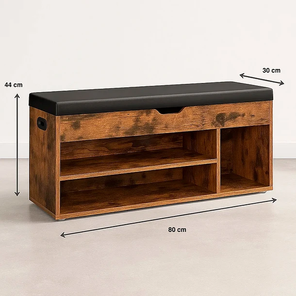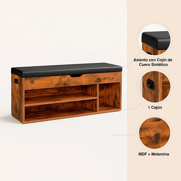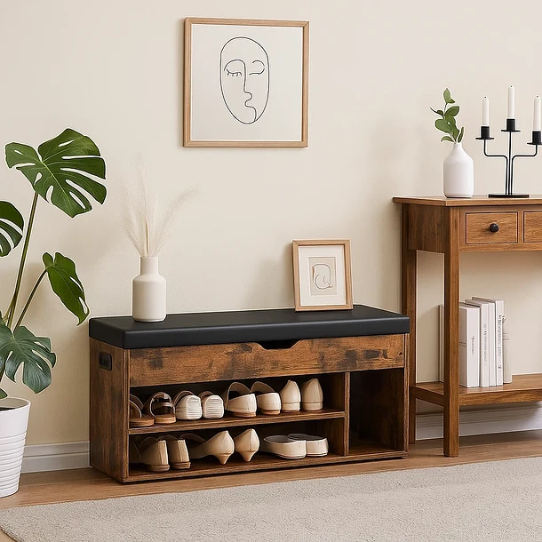 Banco Zapatero de Madera Rústica con Asiento Acolchado y Baúl de Almacenaje