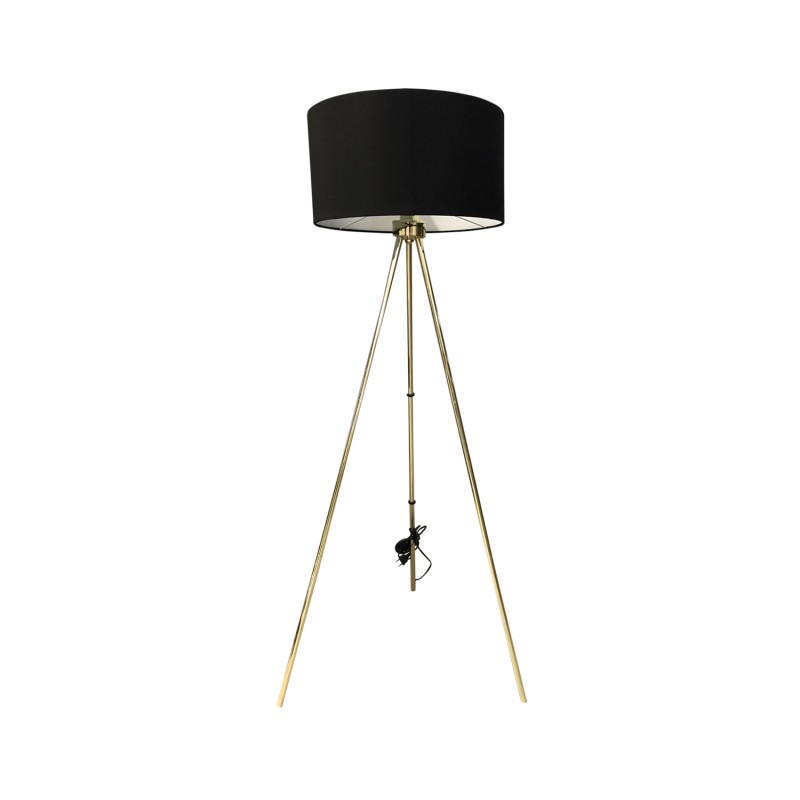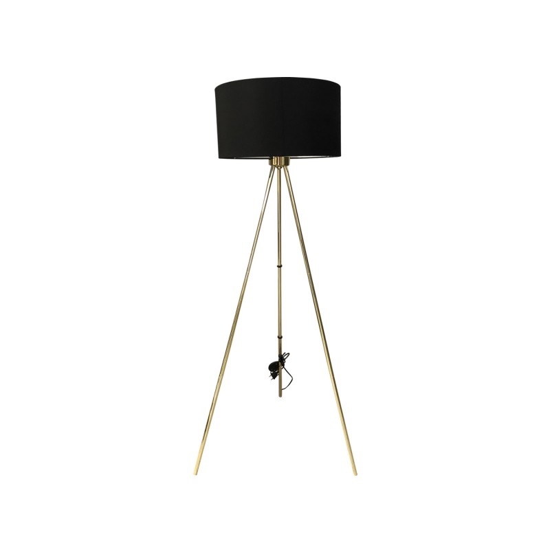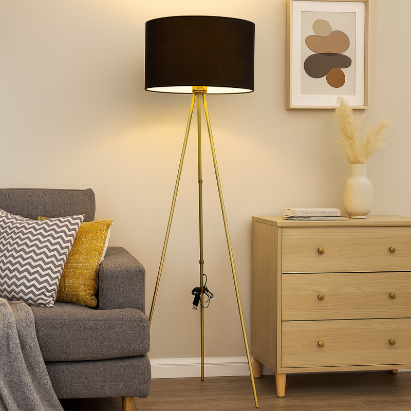 Con una estructura de tres patas metálicas en acabado dorado y una pantalla cilíndrica en color negro, aporta un estilo sofisticado y minimalista que combina fácilmente con distintos ambientes.