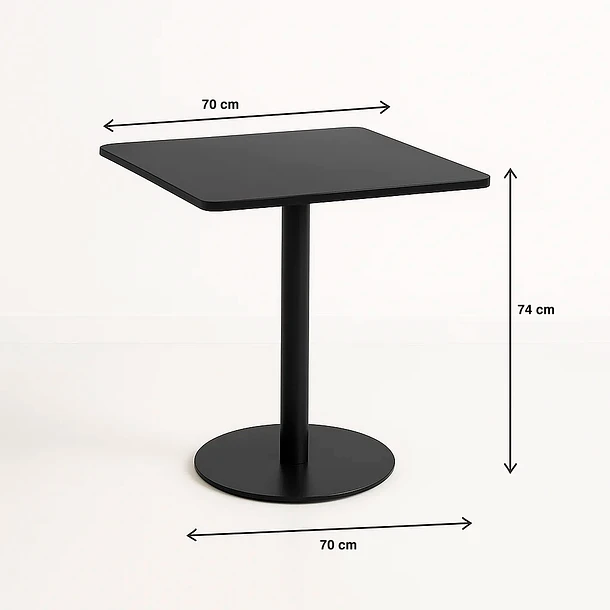 Su estructura de tubo de metal le da una gran resistencia y estabilidad, mientras que la cubierta de MDF aporta un acabado elegante y de fácil limpieza. Con un tamaño compacto de 70×70 cm, esta mesa es perfecta para optimizar el espacio en tu local.