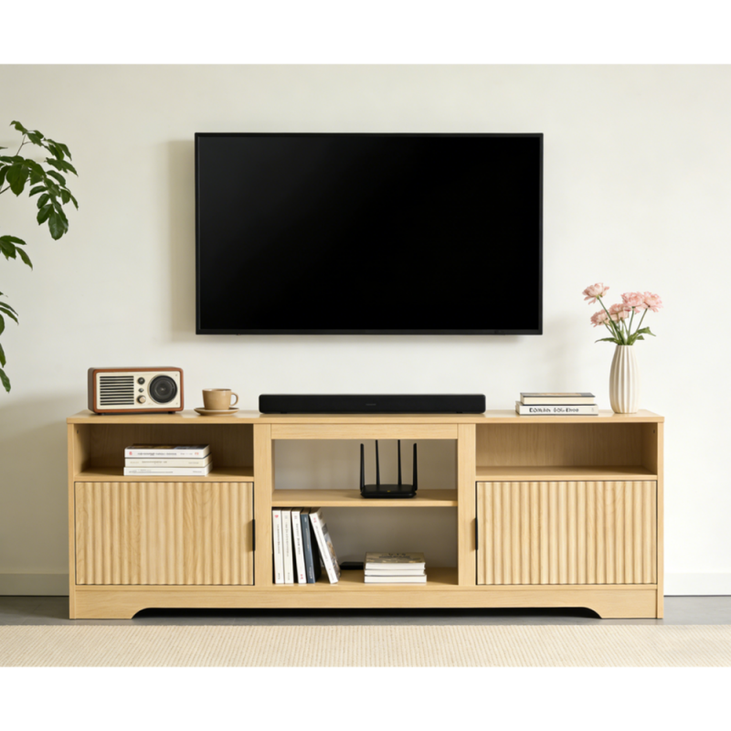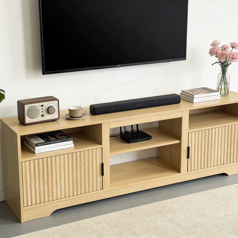 Cuenta con dos puertas laterales decorativas que permiten ocultar objetos y mantener el orden, junto con dos compartimentos centrales abiertos, ideales para consolas, reproductores, decodificadores o equipos de audio. Gracias a su diseño funcional, facilita la organización de cables y accesorios, manteniendo tu espacio limpio y ordenado.