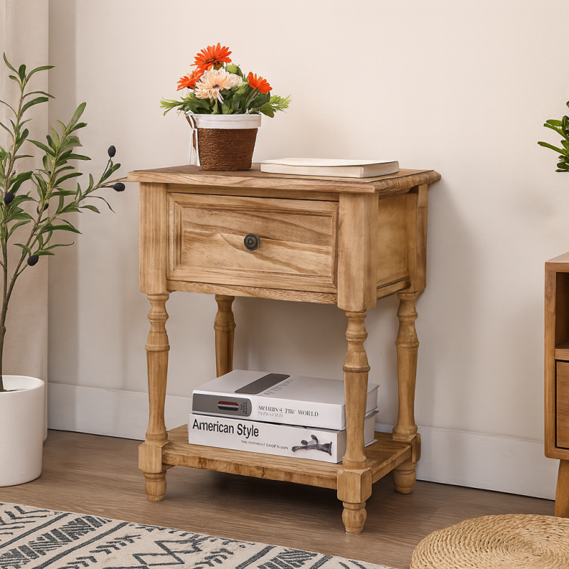 El Velador Provenza Miel 1 Cajón combina la calidez del estilo provenzal con una construcción robusta en madera maciza de tung, destacada por un acabado tono miel que realza sus vetas naturales. Su diseño rústico–elegante, con patas torneadas y líneas clásicas, lo convierte en una pieza decorativa y funcional que aporta carácter a cualquier dormitorio o espacio interior.