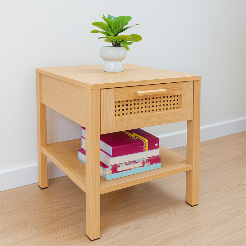 El Velador Siena es la combinación perfecta de diseño moderno y natural. Fabricado en madera clara con un elegante cajón de tejido tipo rattan, aporta calidez y estilo a cualquier dormitorio o sala de estar. Su práctica repisa inferior es ideal para colocar libros, revistas u objetos decorativos, mientras que el cajón superior permite guardar pertenencias de manera discreta y ordenada.