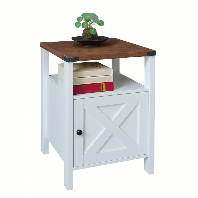 Este velador combina estilo moderno con un diseño rústico funcional, ideal para complementar tu dormitorio o sala de estar. Fabricado con estructura sólida en madera y un acabado en tonos naturales, ofrece una superficie superior para decorar con lámparas, plantas u objetos personales. Incluye un compartimiento abierto perfecto para libros y una puerta inferior con diseño tipo barn door en “X”, que permite mantener tus pertenencias organizadas y fuera de la vista.