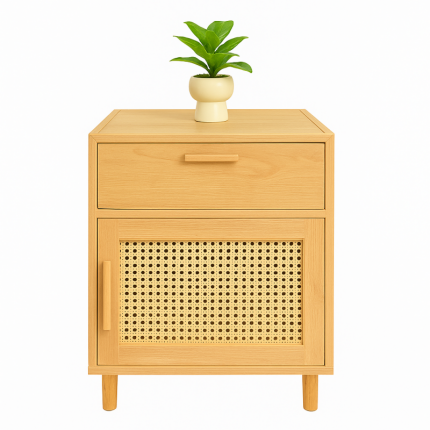 ✅ Diseño moderno y nórdico con madera clara y puerta estilo ratán